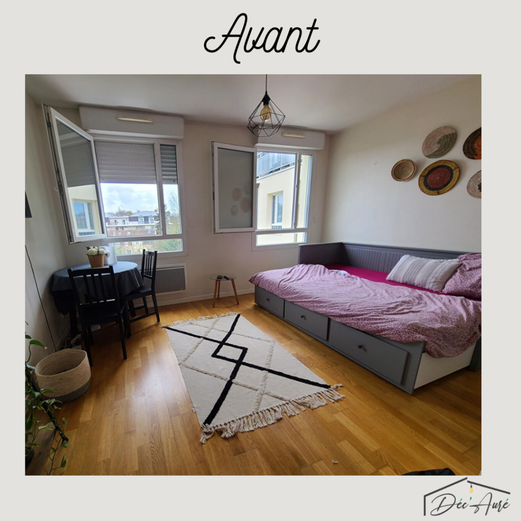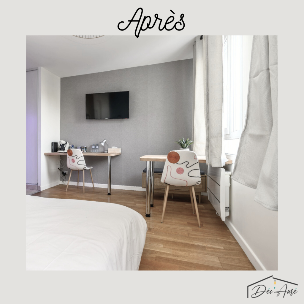Pour donner un nouveau souffle à ce salon, des couleurs pastel, du bois clair, du mobilier plutôt contemporain, une peinture profonde Farrow & ball pour marquer la tête de lit, de quoi avoir envie d’y passer ses soirées !
